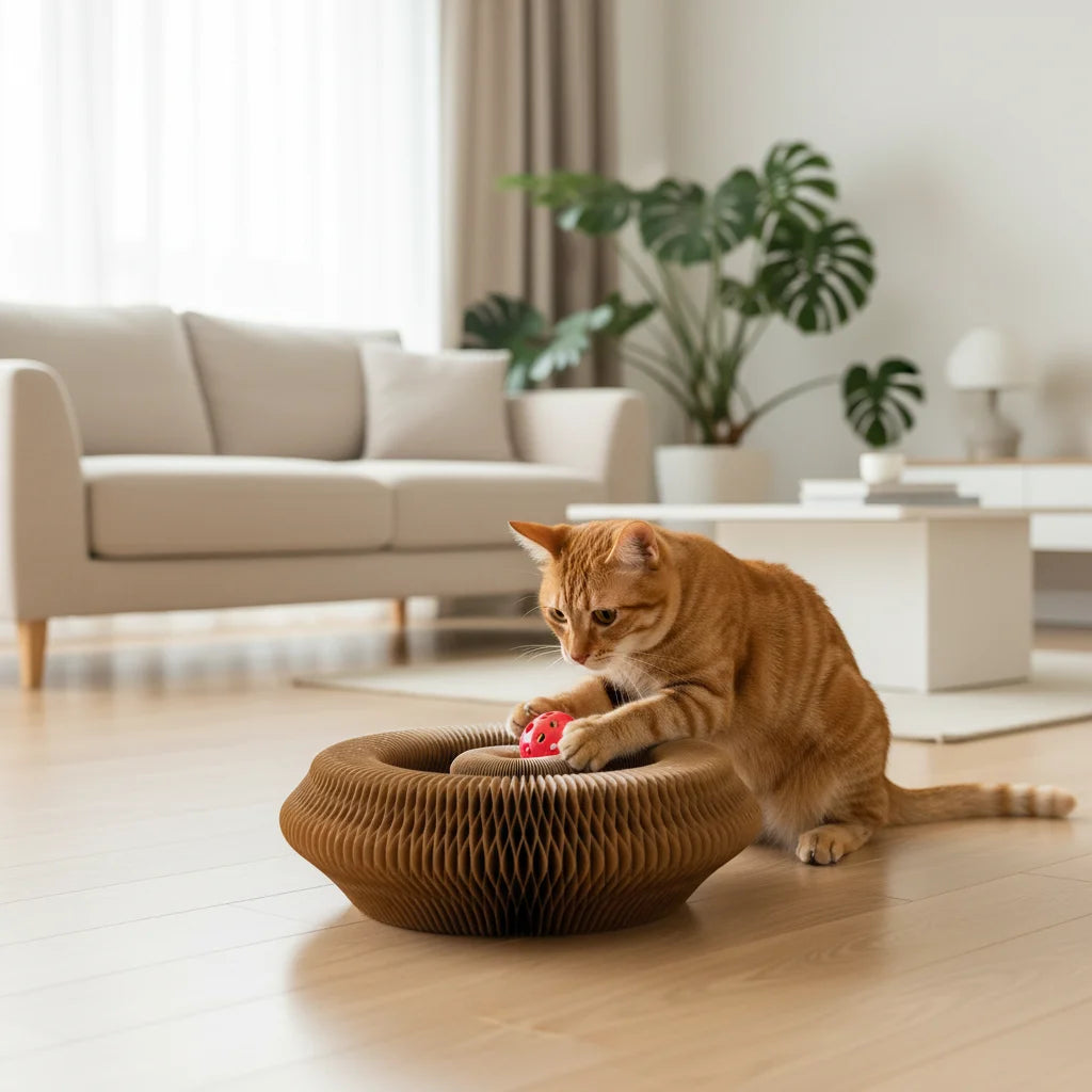 Les chats sont naturellement attirés par les mouvements et les textures. La balle rouge qui roule à l'intérieur de la spirale et la texture unique du carton stimulent leurs instincts de chasse. C'est un succès garanti pour la plupart des félins !